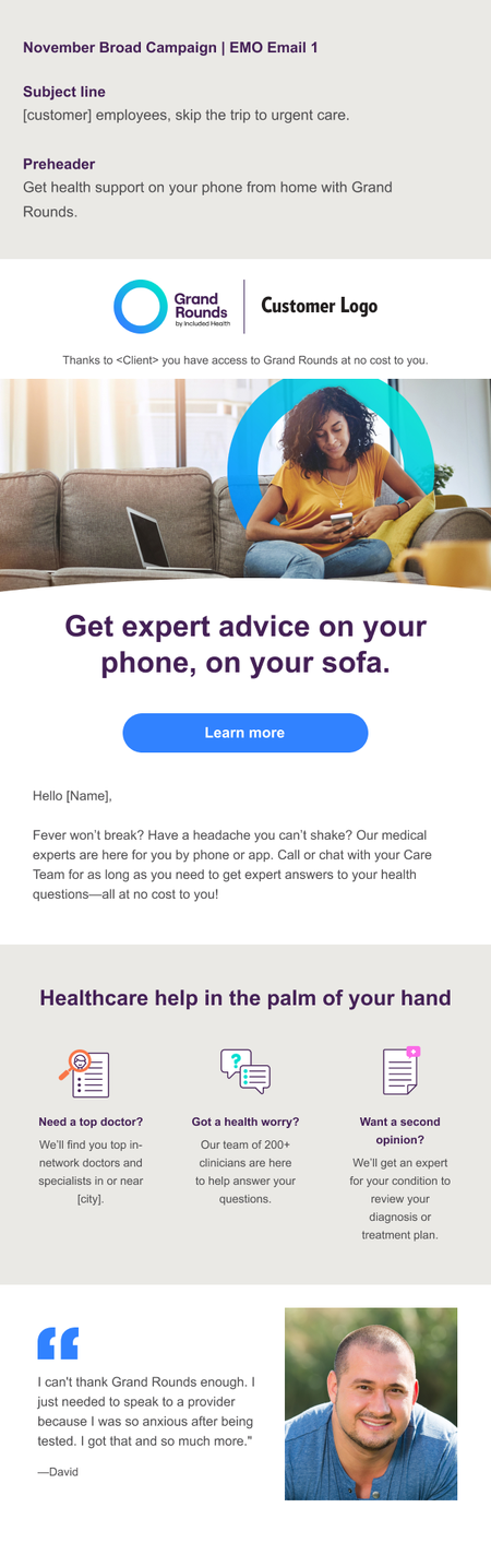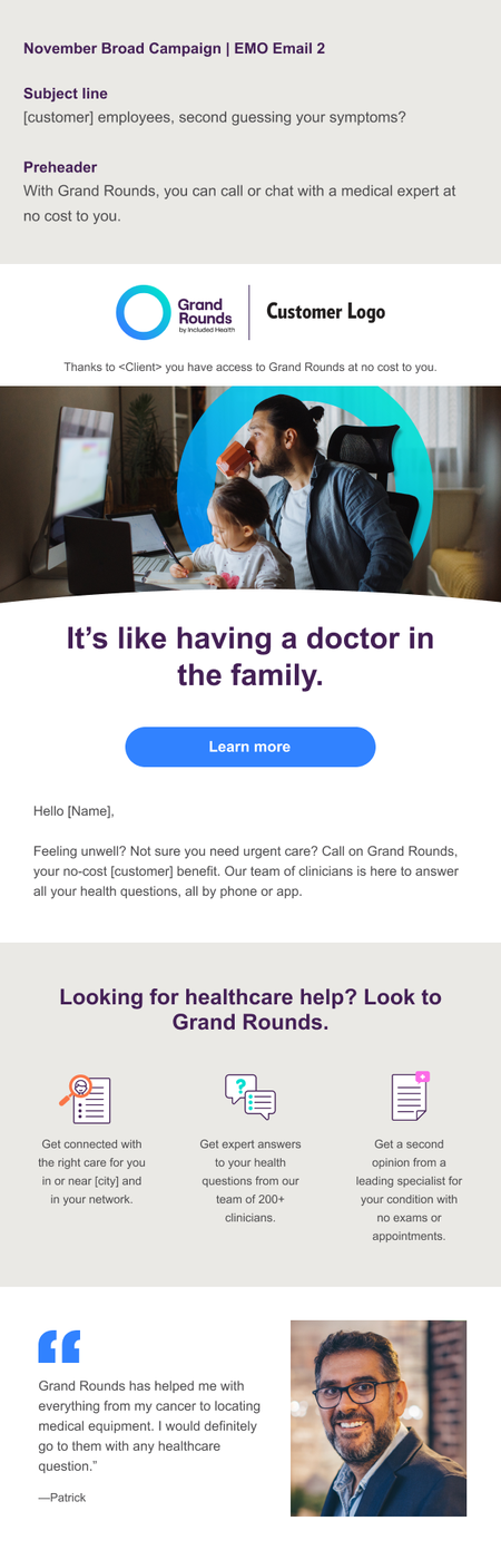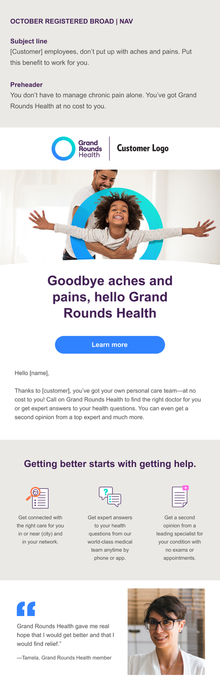 A consistent challenge at Grand Rounds Health was informing our members of the availability of our services as a benefit provided through their employers. Our monthly email journeys endeavored to remedy that. American healthcare is a complex topic already, but can be especially difficult for diverse audiences with low health literacy and whose mother tongue may not be English.