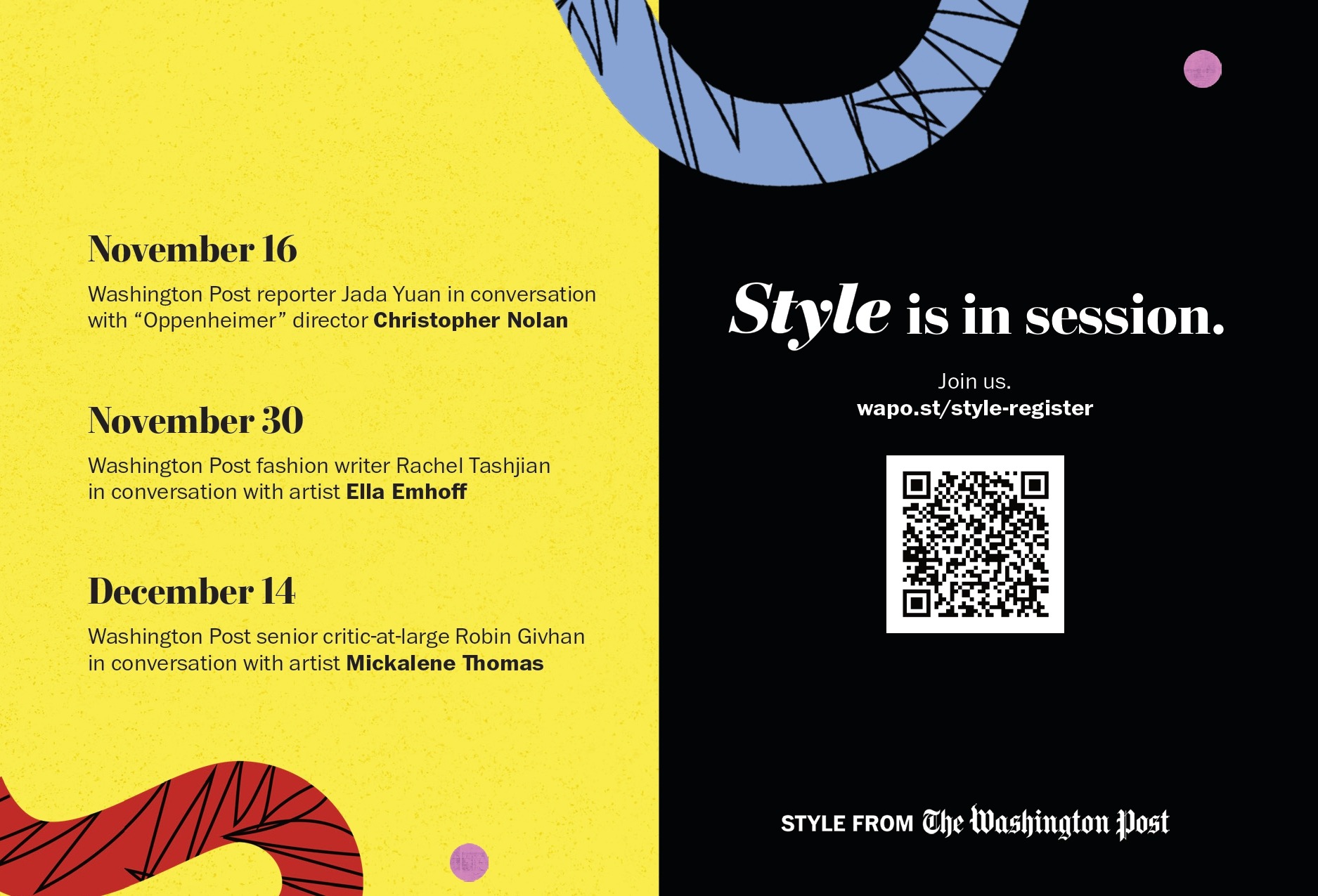 In 2023, The Washington Post relaunched its iconic Style section, introducing readers to a new online destination for stylish news and trends with personality, perspective and deep reporting. To commemorate the relaunch, we commissioned two supersized murals in Williamsburg, Brooklyn. We also produced a series of events branded Style Sessions at The Rubell Museum, featuring A-list guests, such as Christopher Nolan, Ella Emhoff and Ava DuVernay.