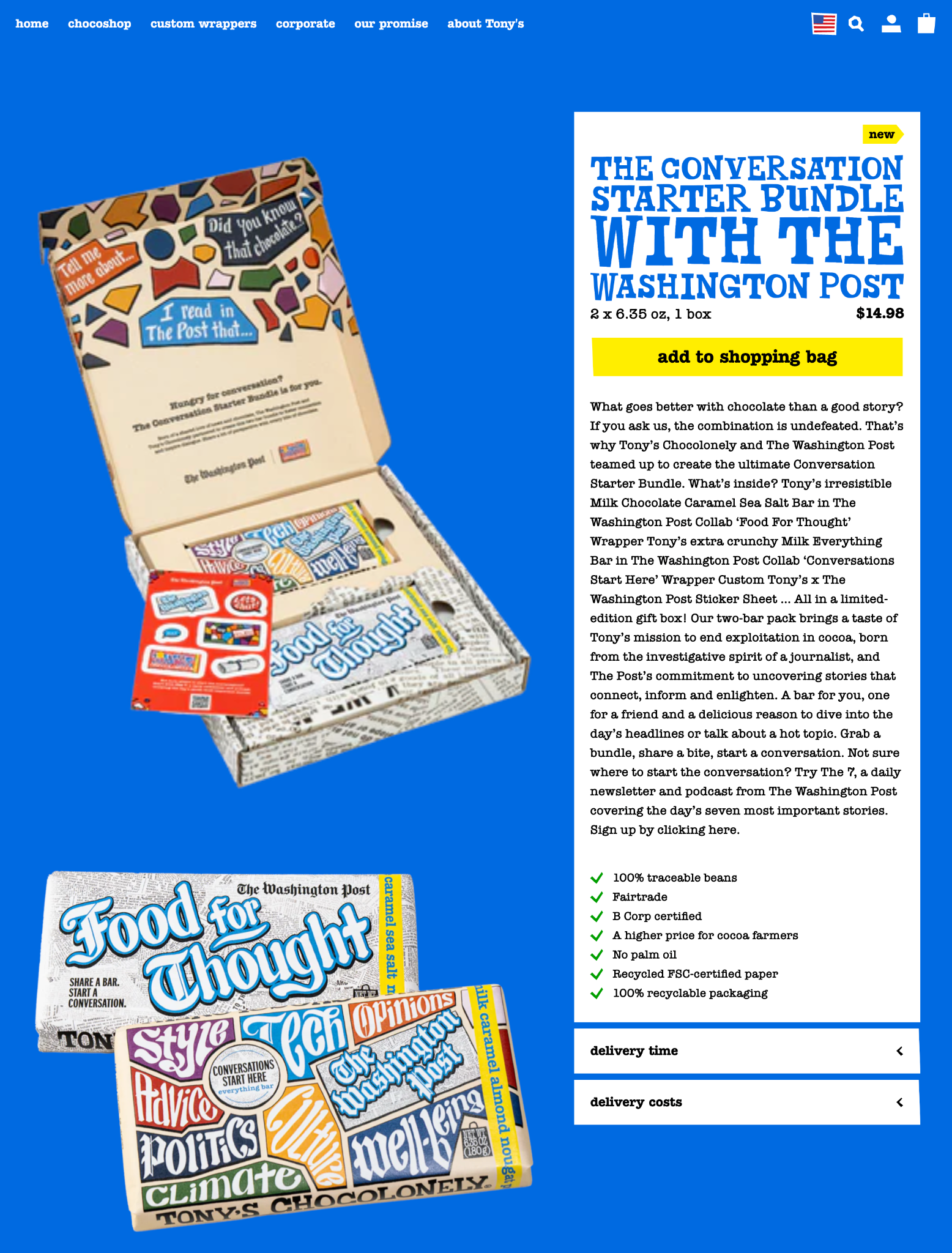 Above: At launch, the Tony's Chocolonely website homepage featured the Conversation Starter Bundle.